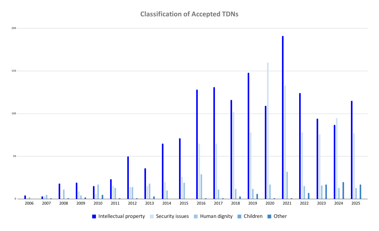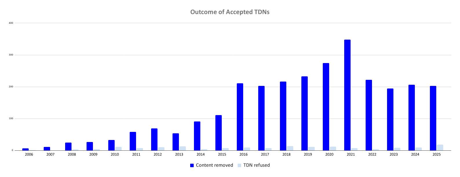 In the interests of transparency, ISPA publishes the overall number of TDNs filed with ISPA each year, and some statistical information about the outcome and categories of the notices.
